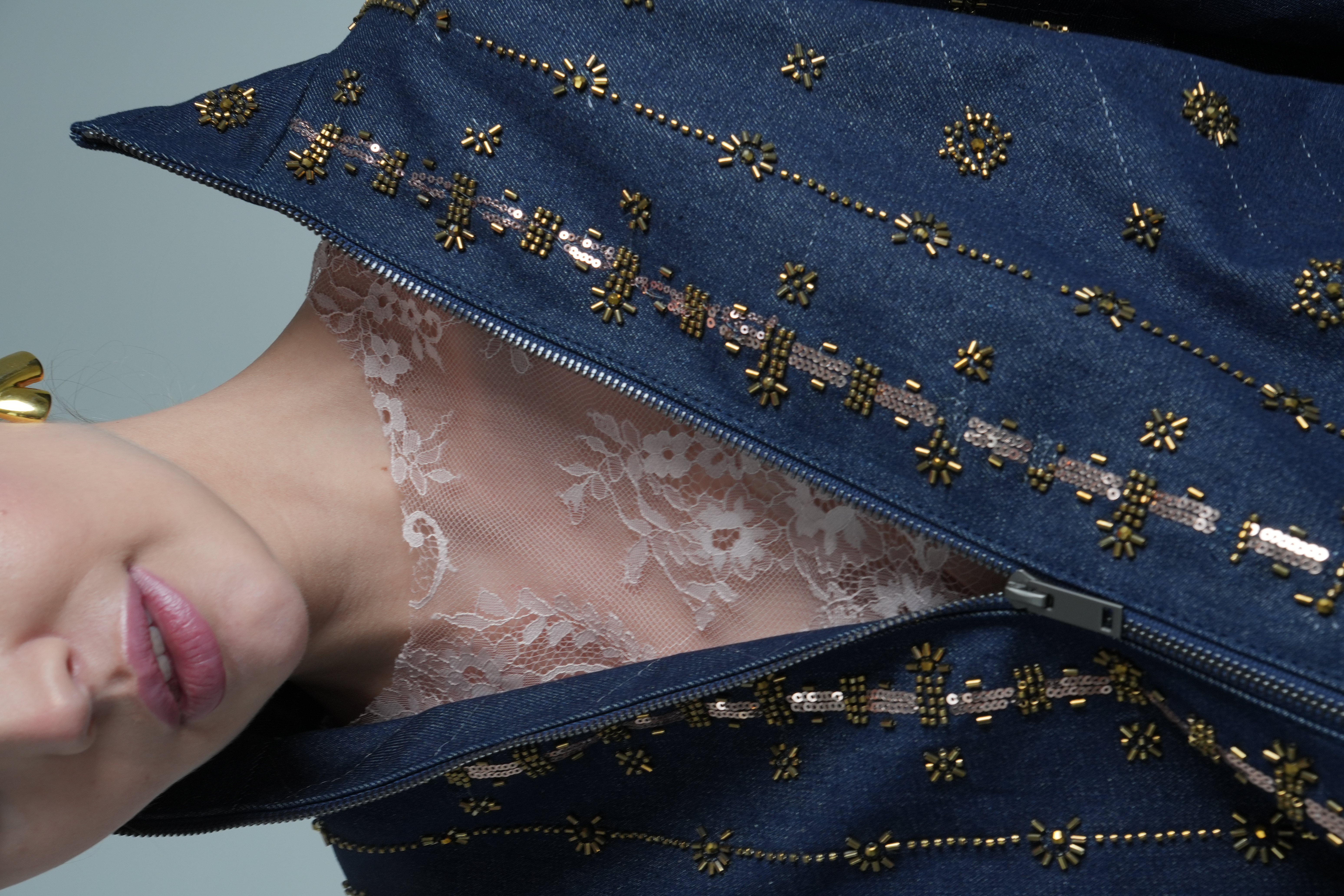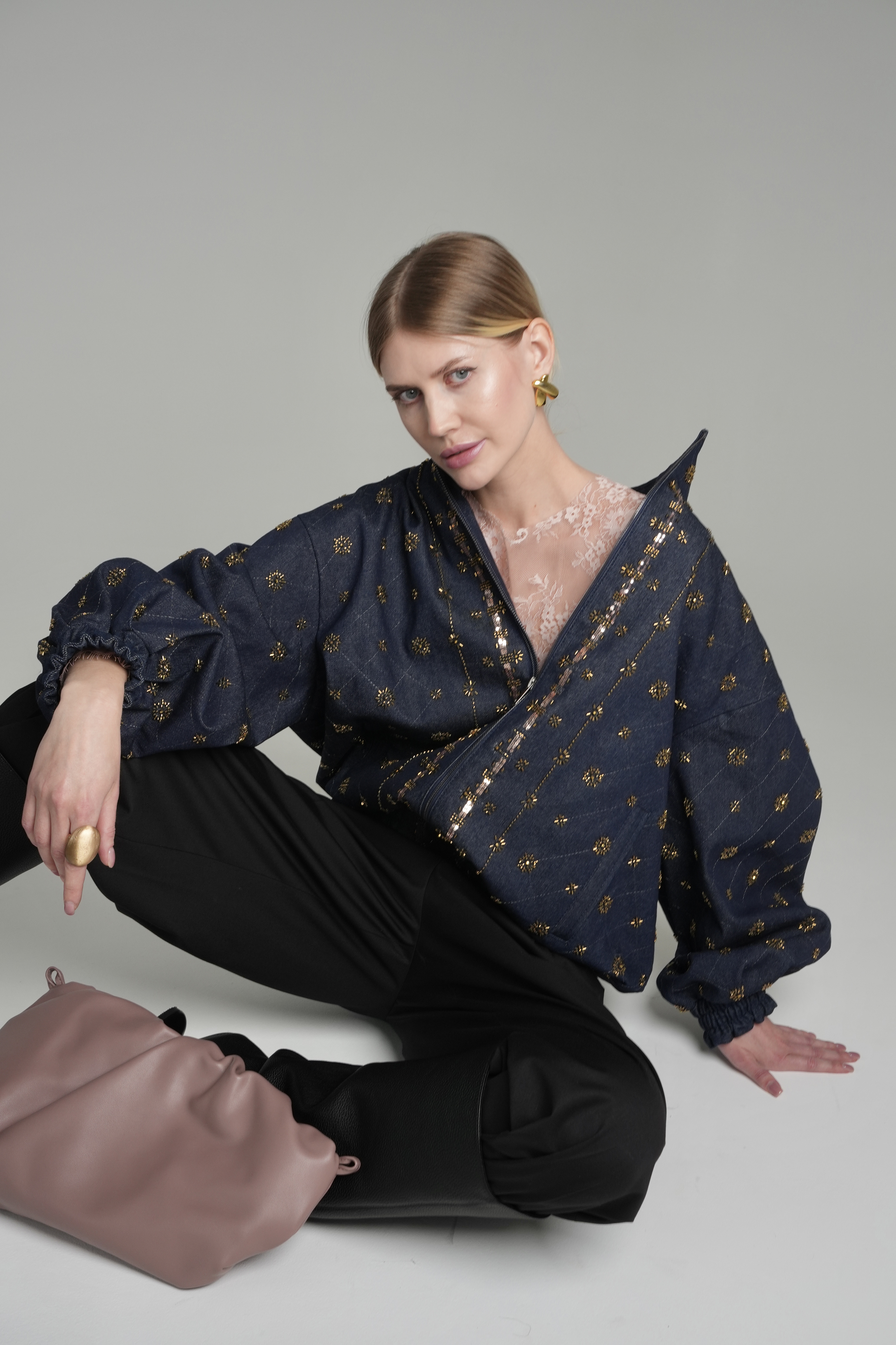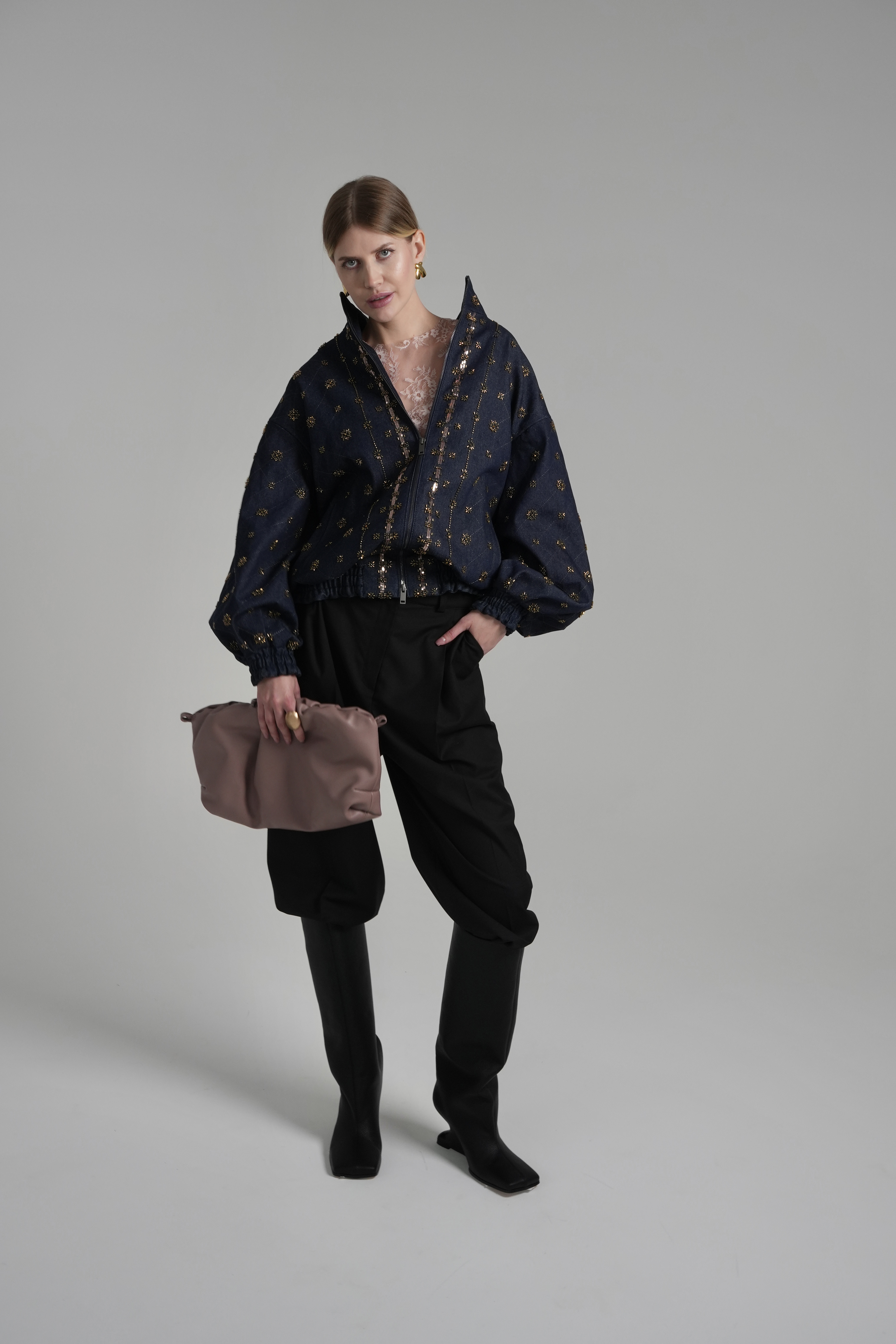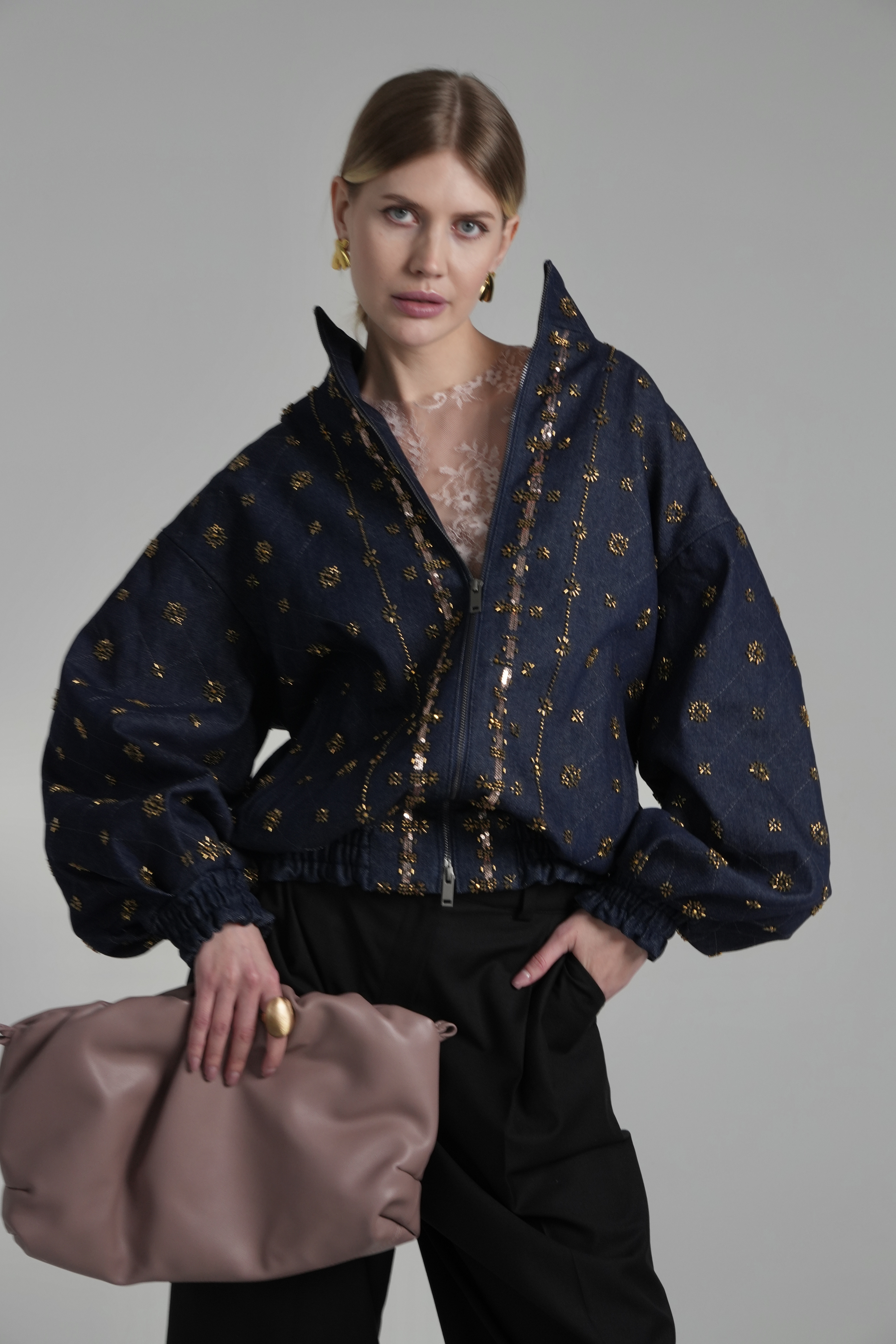 Высокий воротник-стойка, спущенная линия плеча и эластичные манжеты создают актуальный силуэт oversize, который легко интегрируется как в вечерний образ с платьем-комбинацией, так и в расслабленный повседневный аутфит.