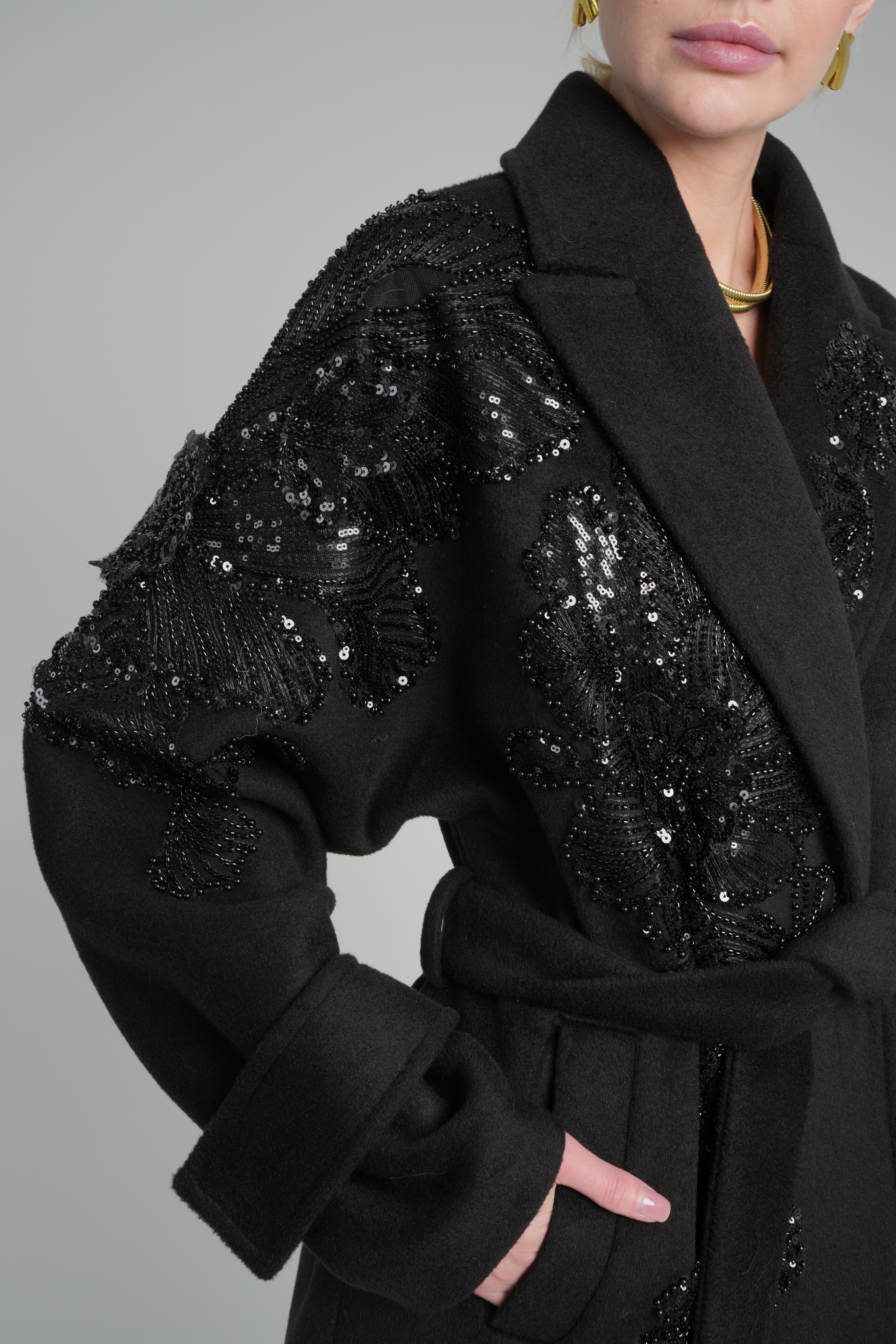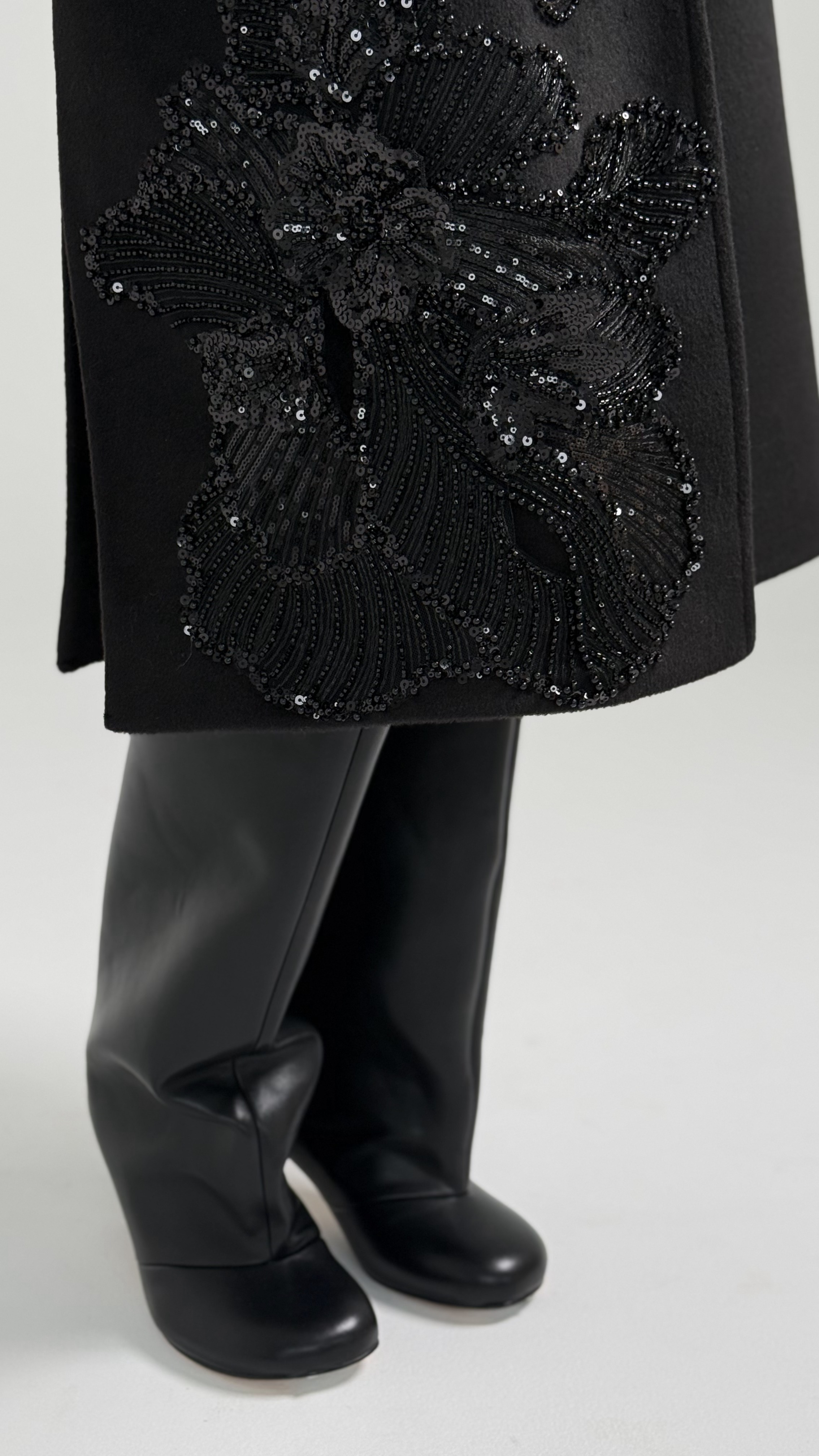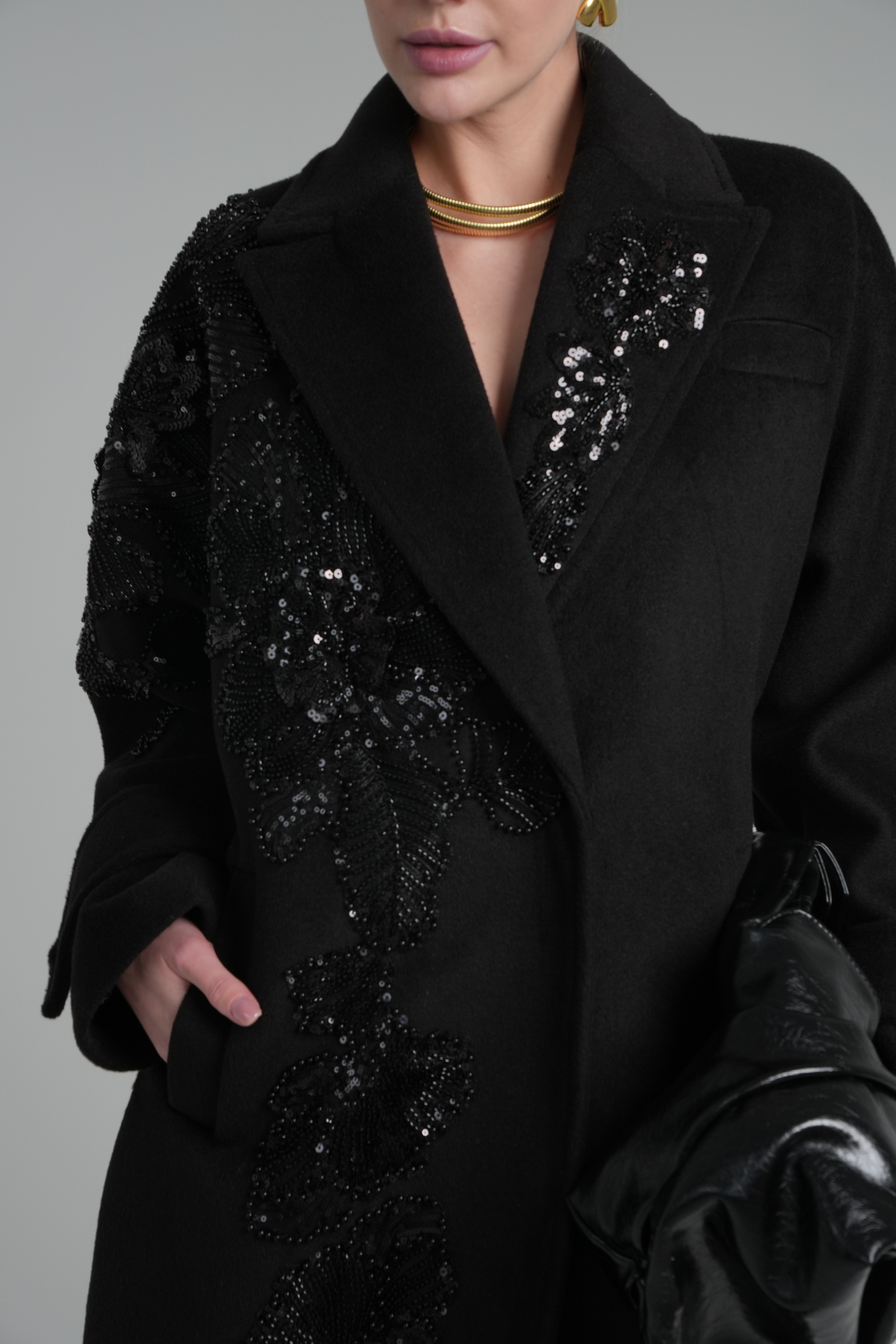 Пальто свободного кроя в черном цвете с ручной вышивкой.