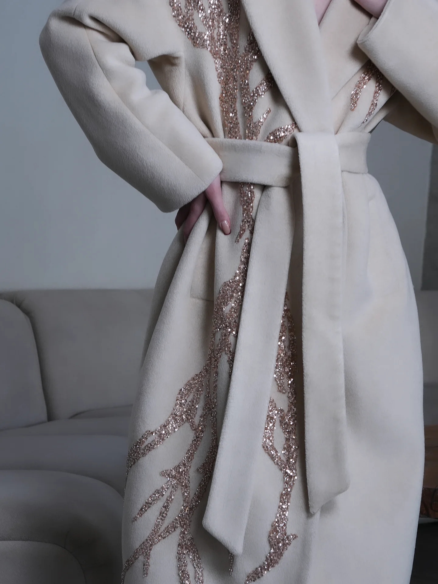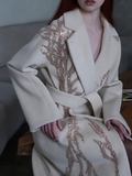 Изысканный крой: Двубортный фасон и отложной воротник с широкими лацканами создают строгий, но женственный силуэт.