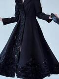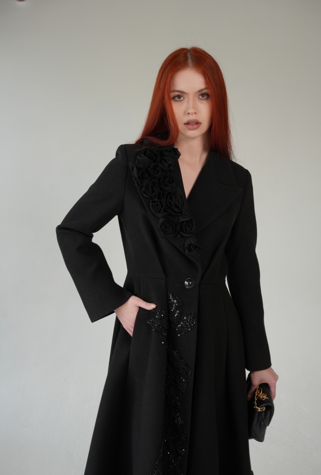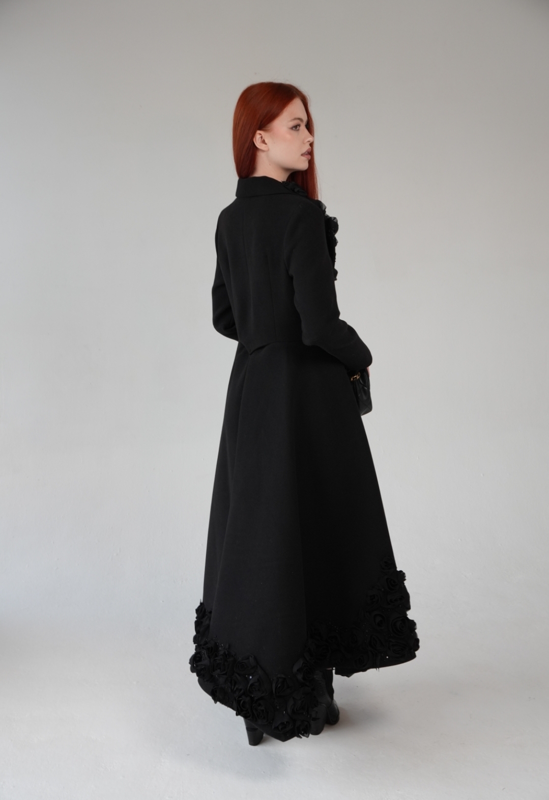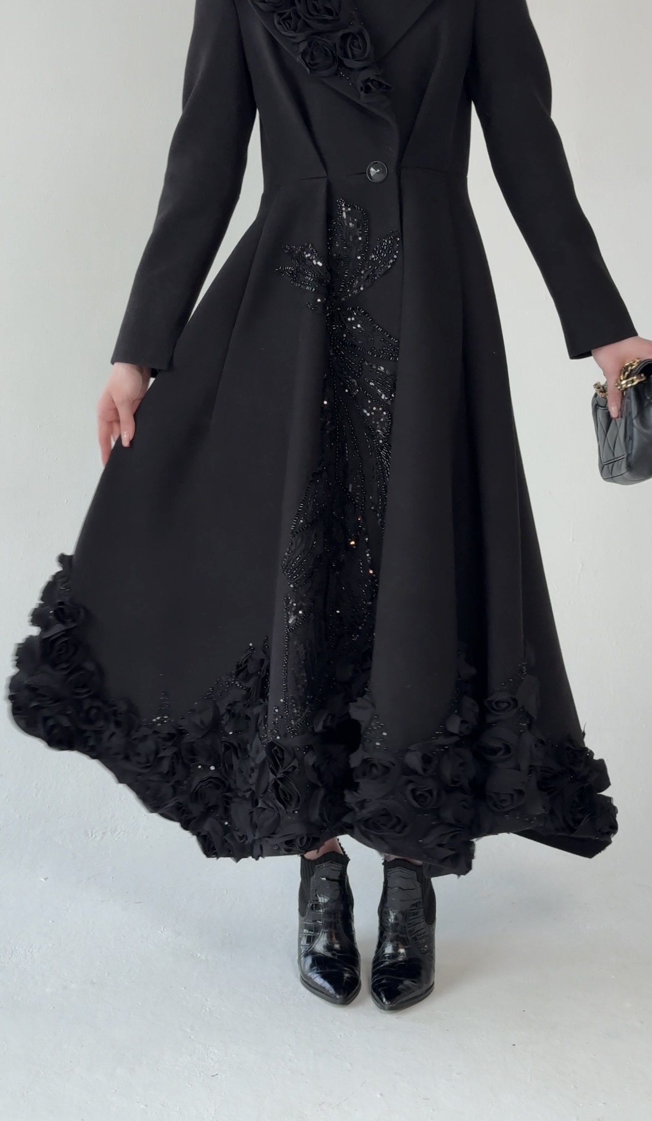 Роскошное черное пальто с розами и вышивкой. Эффектный силуэт, длина макси. Идеально для вечернего выхода или как акцентный элемент повседневного образа.
