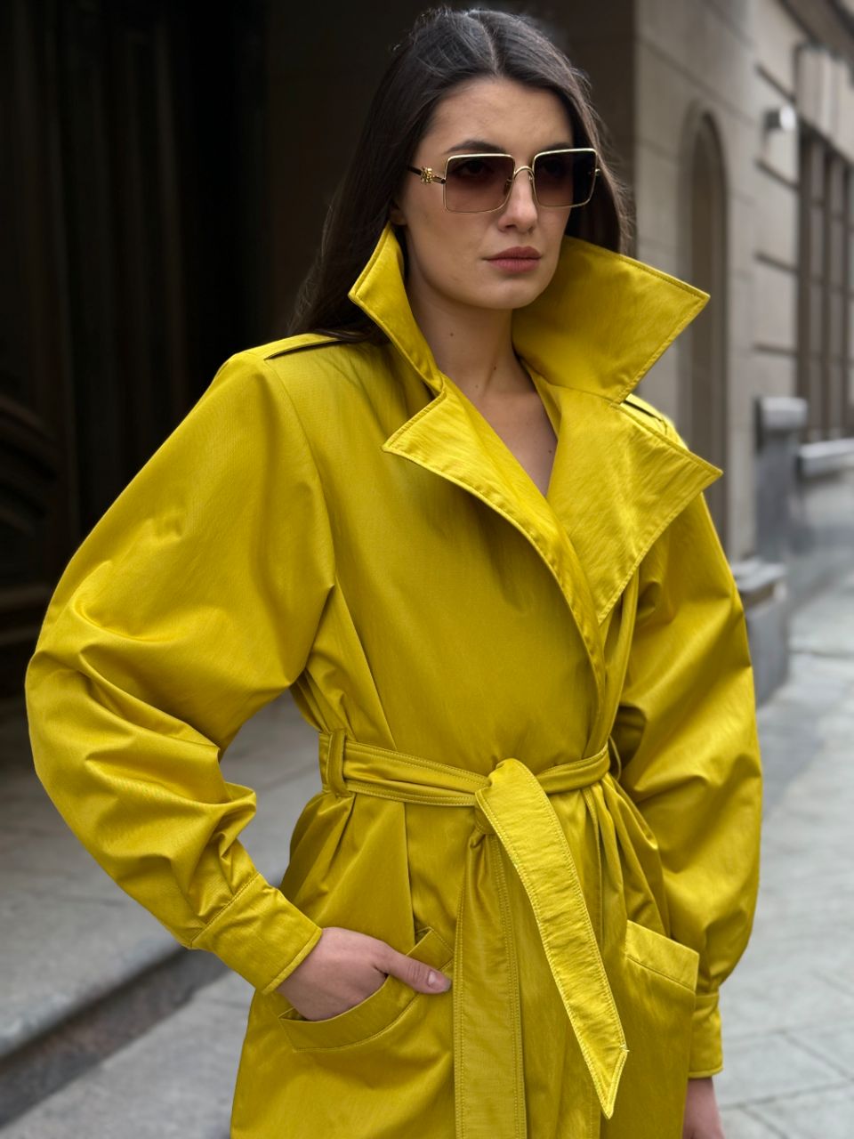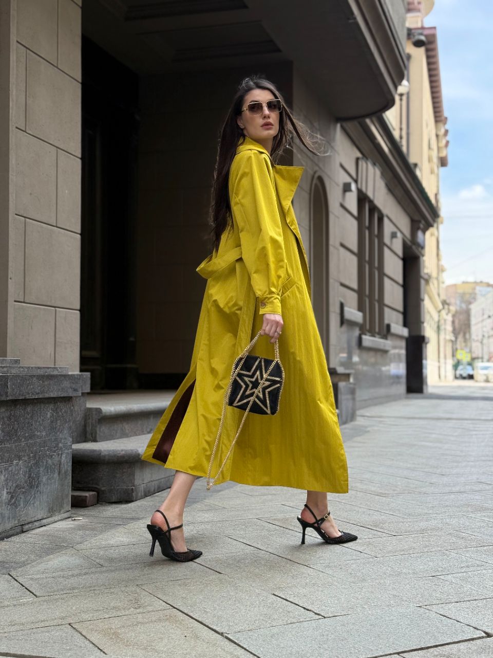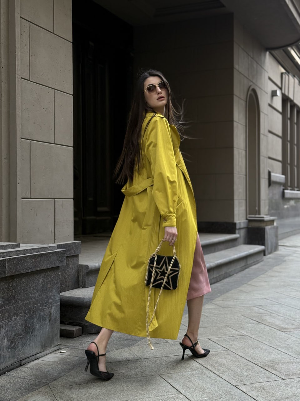 Наполните будни энергией цвета. Этот тренч — воплощение свободы и современного стиля. Утрированный оверсайз-силуэт в сочетании с сочным лимонным оттенком создает эффектный образ, который невозможно не заметить. Легкий, летящий и невероятно стильный — он станет главной деталью вашего весеннего гардероба.