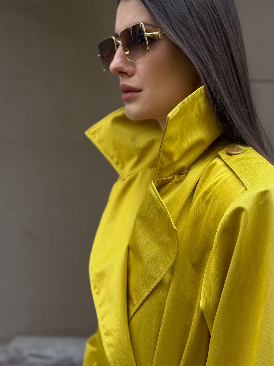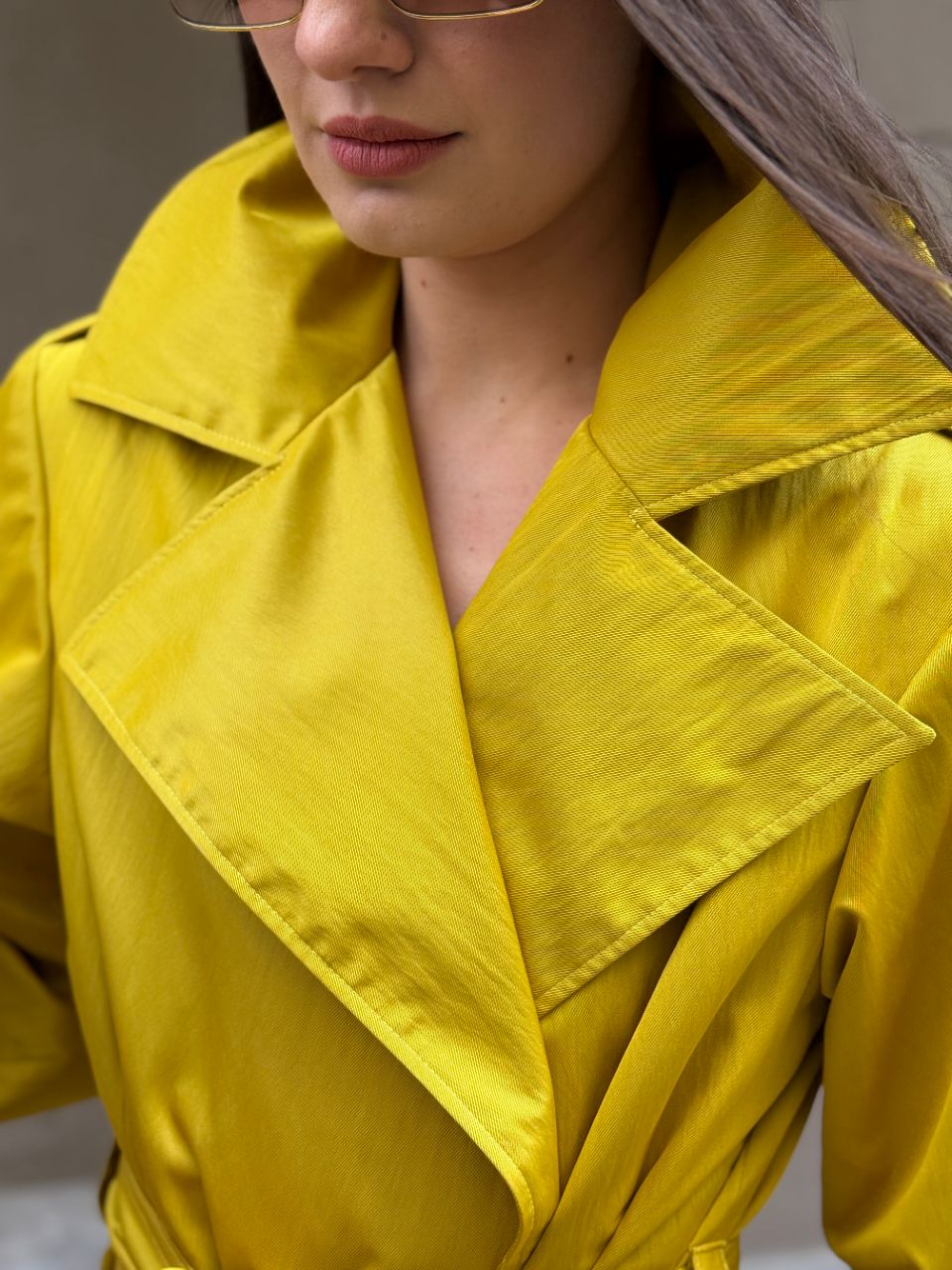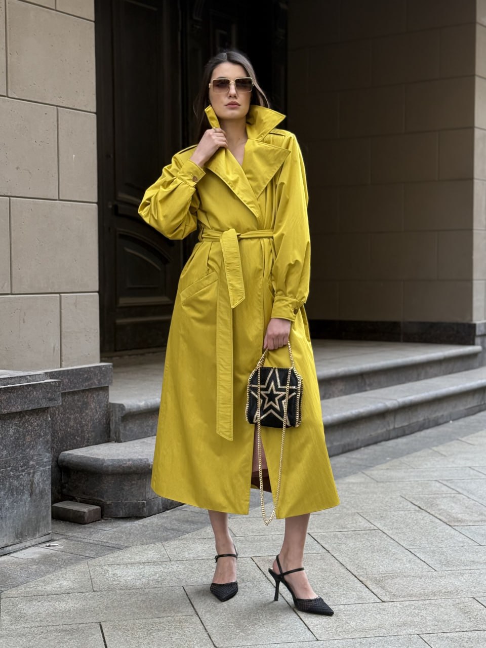 Наполните будни энергией цвета. Этот тренч — воплощение свободы и современного стиля. Утрированный оверсайз-силуэт в сочетании с сочным лимонным оттенком создает эффектный образ, который невозможно не заметить. Легкий, летящий и невероятно стильный — он станет главной деталью вашего весеннего гардероба.